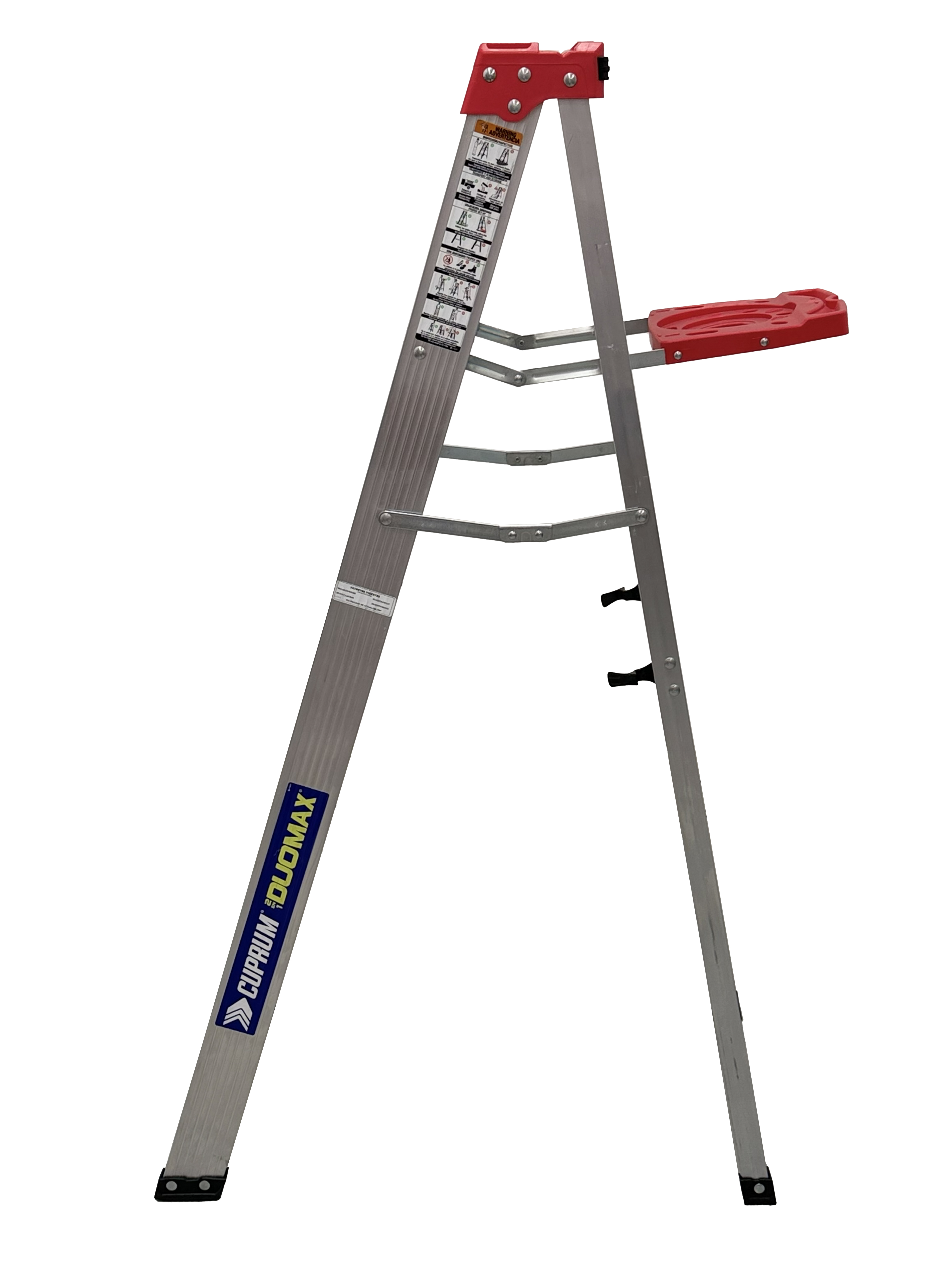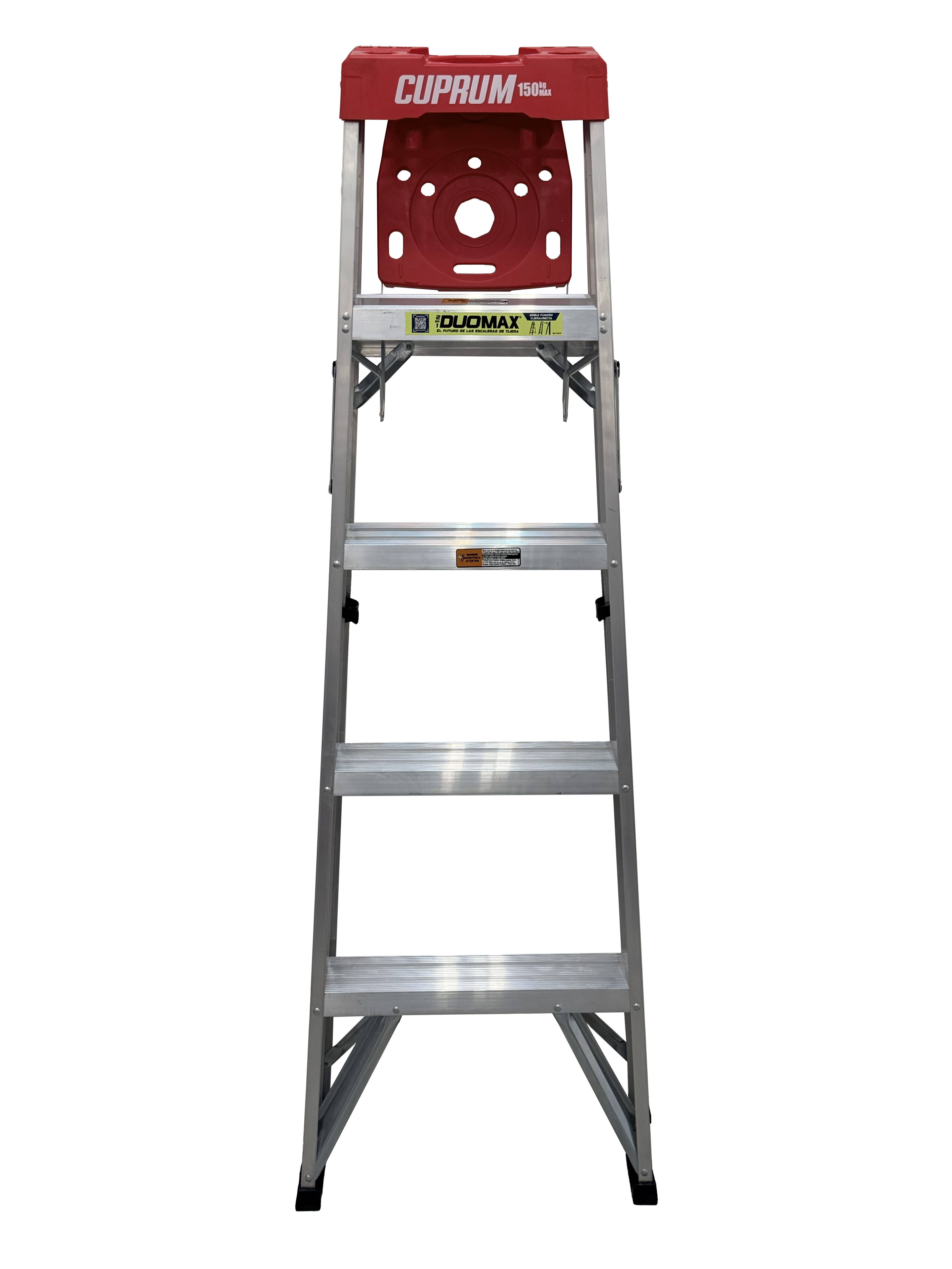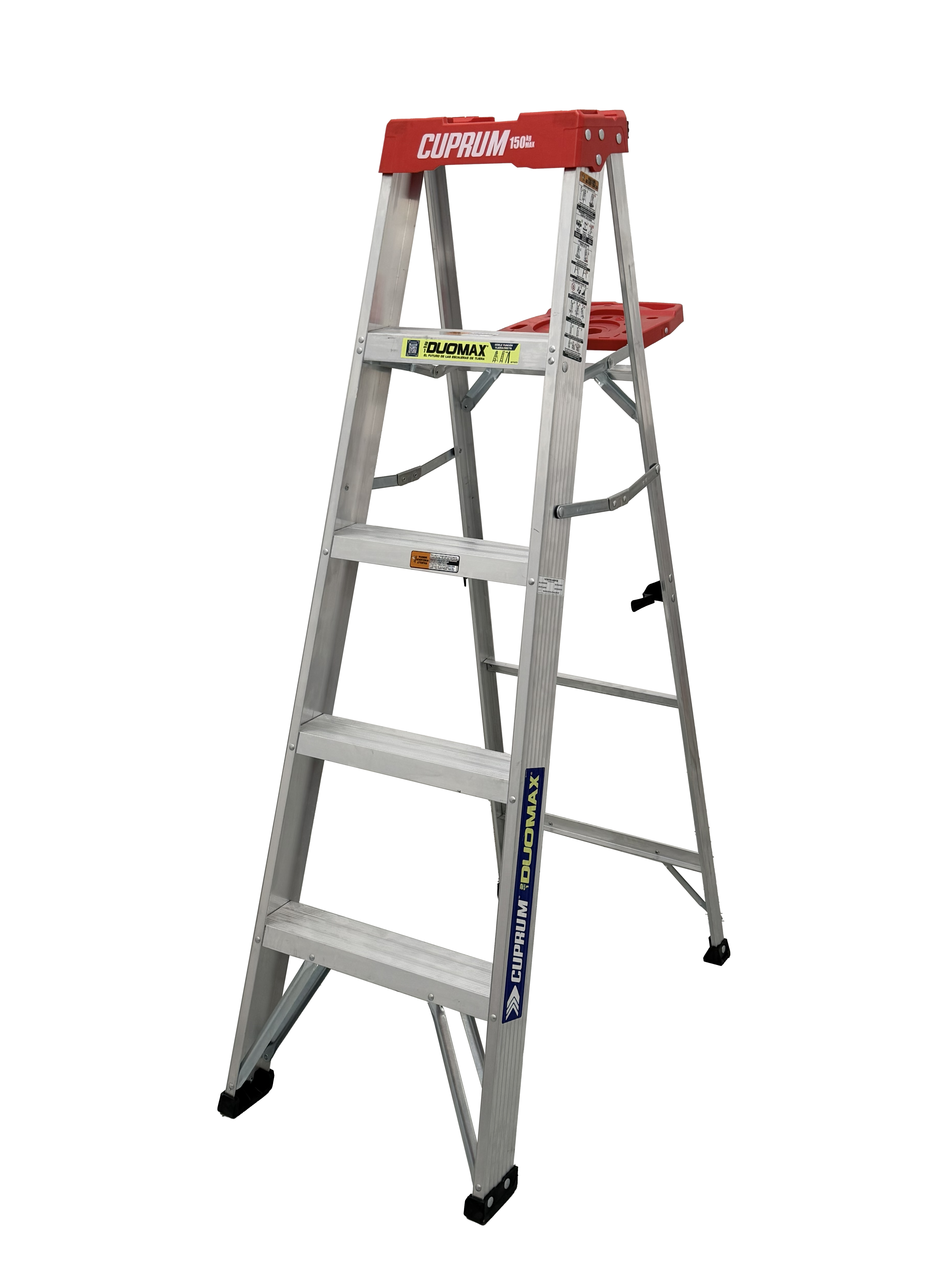 "Esta escalera de aluminio Cuprum DUOMAX de 5 pies, con capacidad de carga de 150kg (Tipo III); combina la funcionalidad de una escalera de Tijera y una escalera Recta.