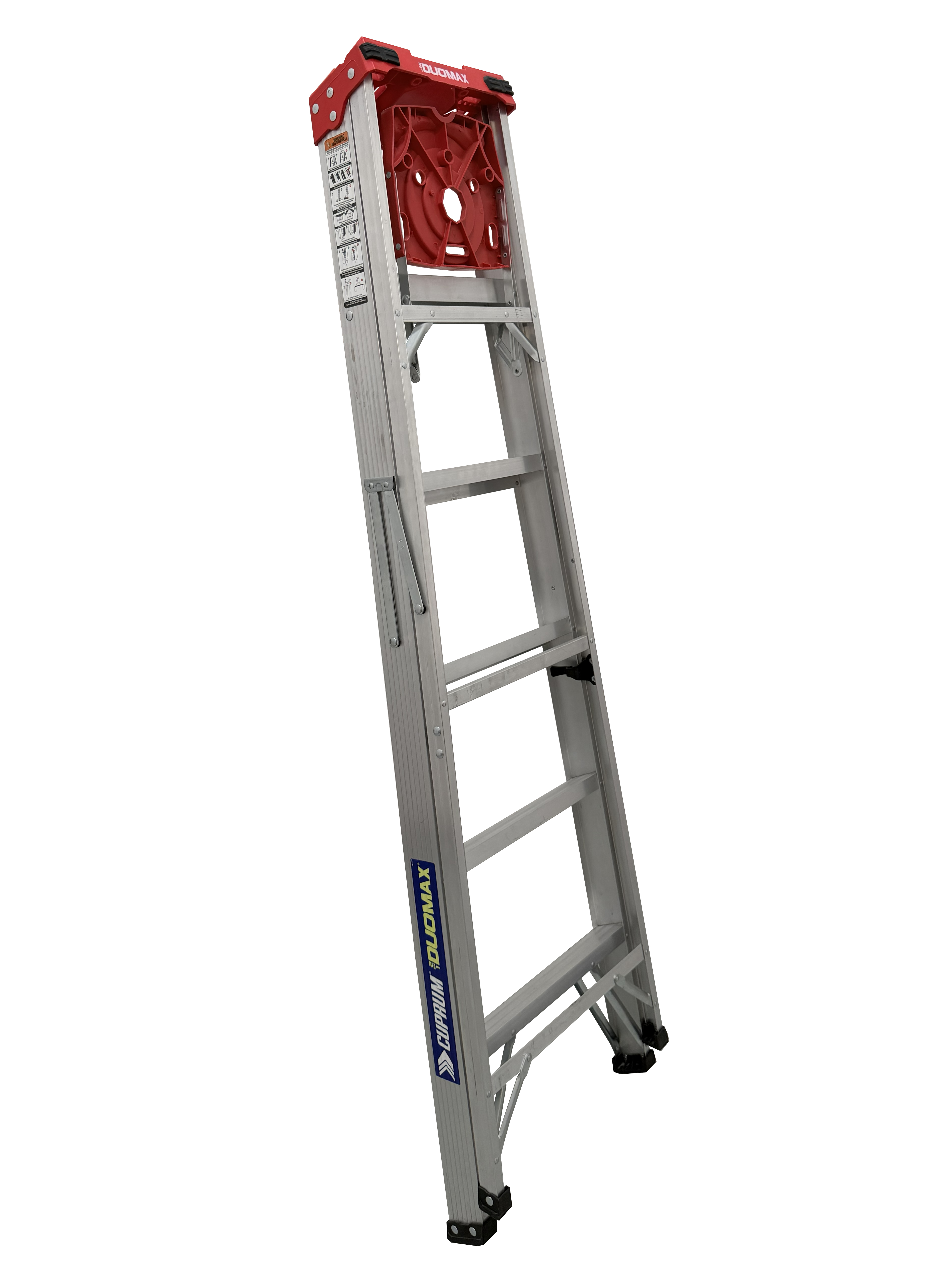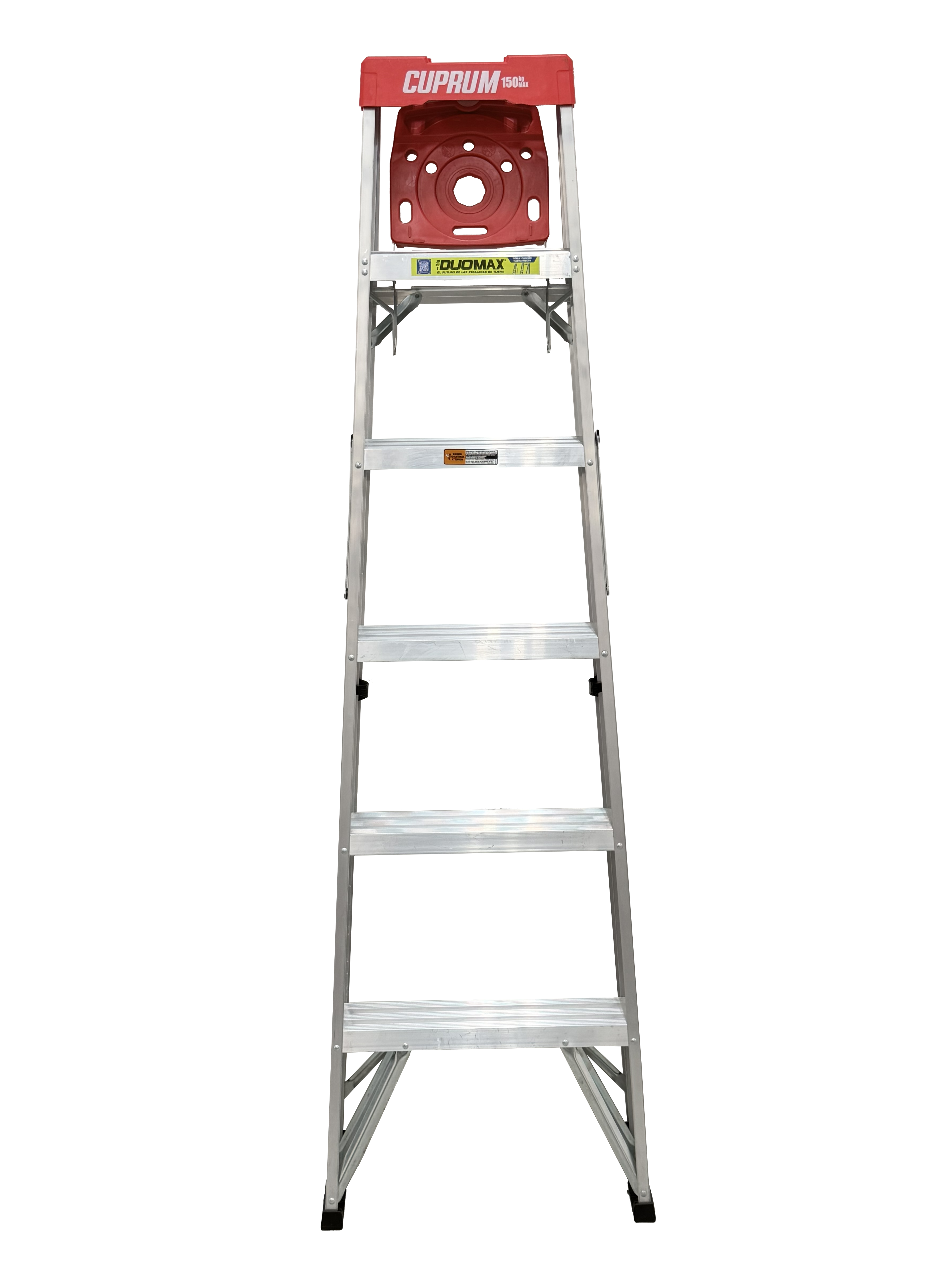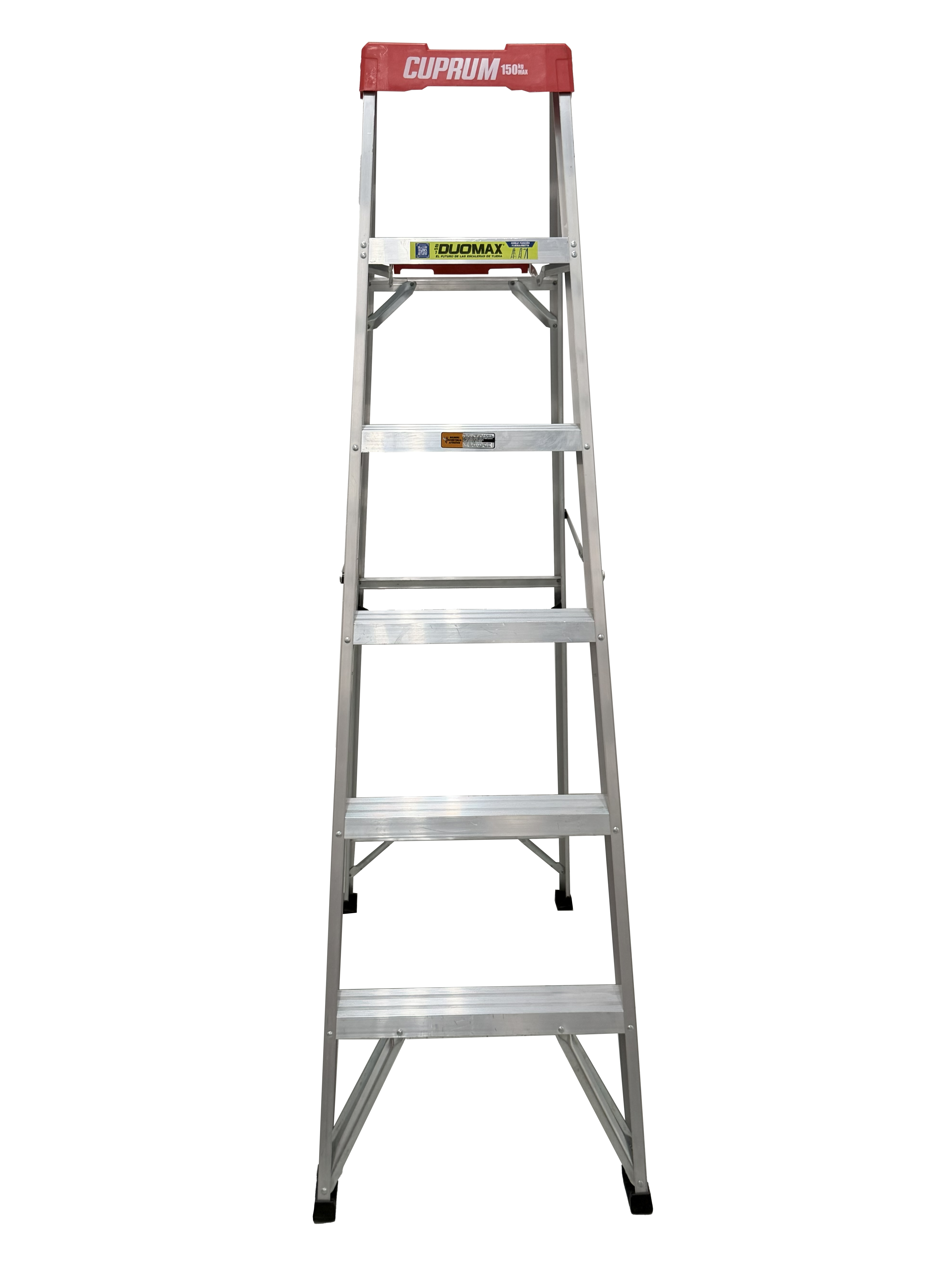 "Esta escalera de aluminio Cuprum DUOMAX de 6 pies, con capacidad de carga de 150kg (Tipo III); combina la funcionalidad de una escalera de Tijera y una escalera Recta.